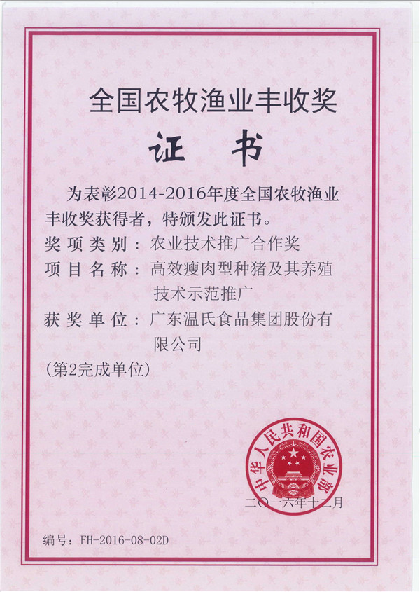 • 天下农牧渔业丰收奖-尊龙凯时Z6股份《高效瘦肉型种猪及其养殖手艺树模推广》(第2完成单位)