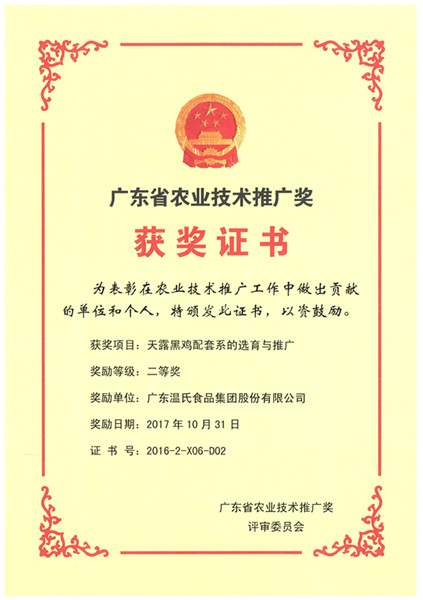 • 2017年10月,,,广东省农业手艺推广奖二等奖—尊龙凯时Z6股份项目《天露黑鸡配套系的选育与推广》_副本.jpg